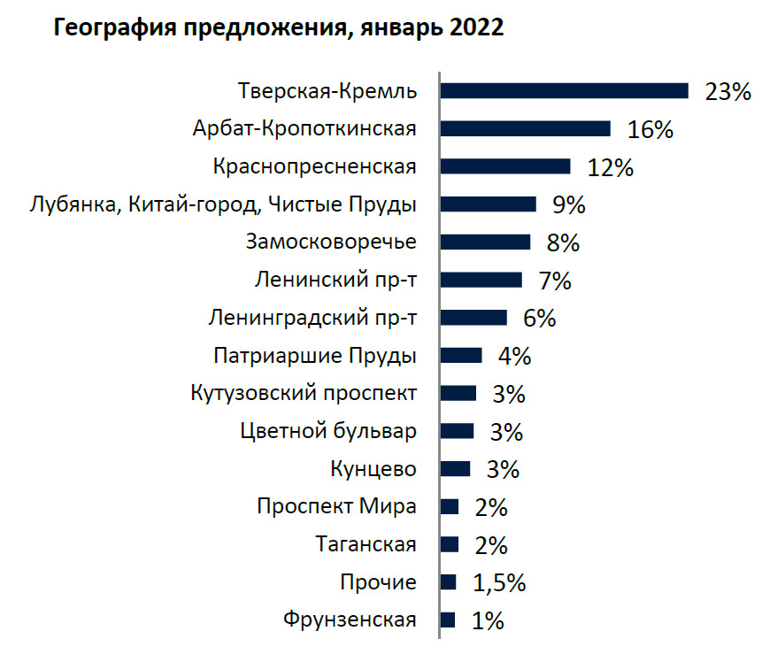 Если рассматривать ультра премиальный сегмент, то по состоянию на январь 2022 года значение индекса PCM TOP-100 составило $22 860 за объект в месяц. За последний год данный индекс увеличился на 1%. Наибольший объем квартир из рейтинга традиционно приходится на локацию Арбат-Кропоткинская (более трети объектов-36%). Кроме того, значительное число самых дорогих лотов предлагается в Тверском и Краснопрес-ненском районах 13% и 10% объектов соответственно). Мы отмечаем тенденцию увеличения премиальных предложений в сравнении с прошлым годом в следующих районах: Патриаршие пруды, Лубянка – Китай-город – Чистые Пруды, Кутузовский проспект и Фрунзенская.