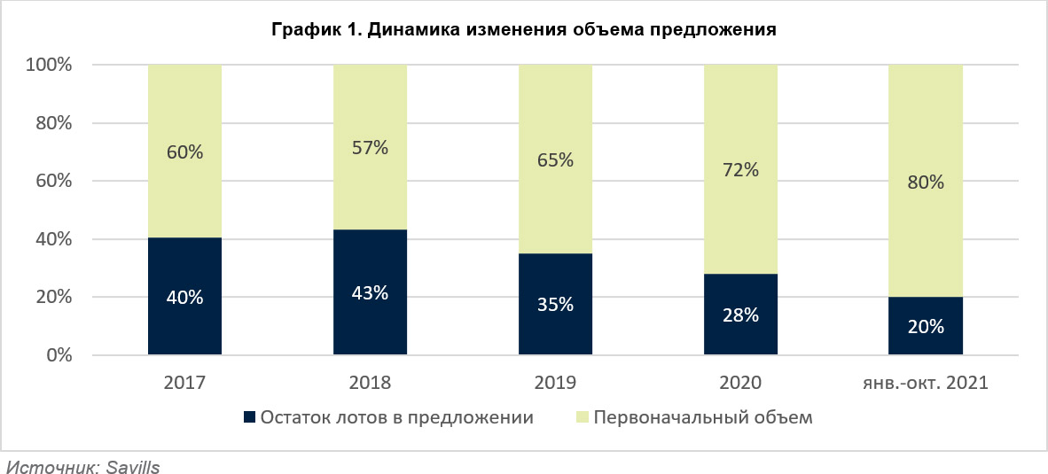 Исторически столь низкий уровень объема предложения может быть сопоставим лишь с 2008 годом, когда данный показатель составлял 25%.