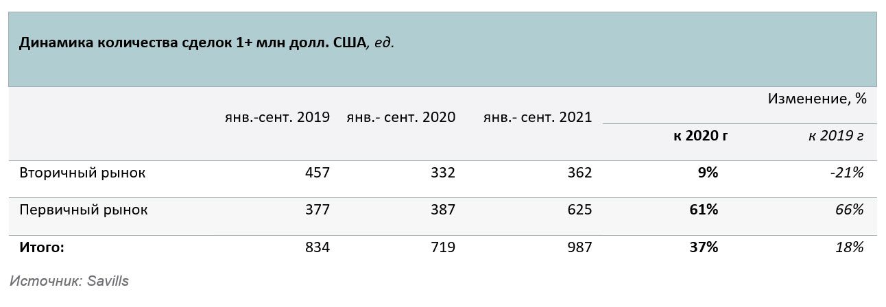 С января по сентябрь 2021 года на премиальном рынке жилой недвижимости Москвы было приобретено 987 квартир и апартаментов стоимостью свыше 1 млн долл. США, что на 37% выше показателя годом ранее. За 9 месяцев 2021 года покупатели с бюджетами от $1 млн за лот потратили около 135 млрд рублей, 60% из которых традиционно пришлась на первичный рынок – 81 млрд руб.
