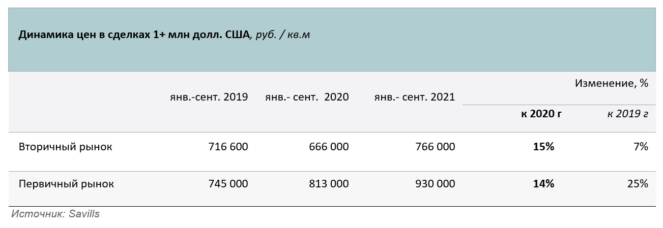 Цены сделок с объектами от 1 млн долл. США демонстрируют динамичный прирост. С начала года рост стоимости сделок составил +15% на первичном рынке и 14,4% на готовые квартиры. Средневзвешенные цены сделок в период с января по сентябрь 2021 года составили 766 тыс. руб./кв.м и 930 тыс. руб./кв.м (вторичный рынок и первичный рынок соответственно). Средняя стоимость проданной элитной квартиры в бюджетах свыше 1 млн долл. США на первичном и вторичном рынке составила 130 млн руб. и 148 млн руб. соответственно. Средняя цена предложения по итогам месяца составила 1,2 млн руб/кв.м, что на 30% выше показателя годом ранее.