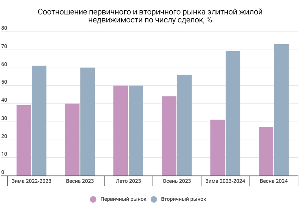 60% составила доля вторичных сделок в общей структуре спроса на рынке элитной жилой недвижимости Москвы.
